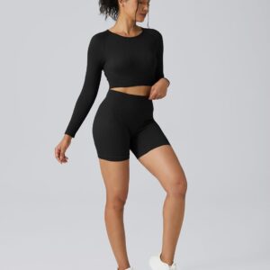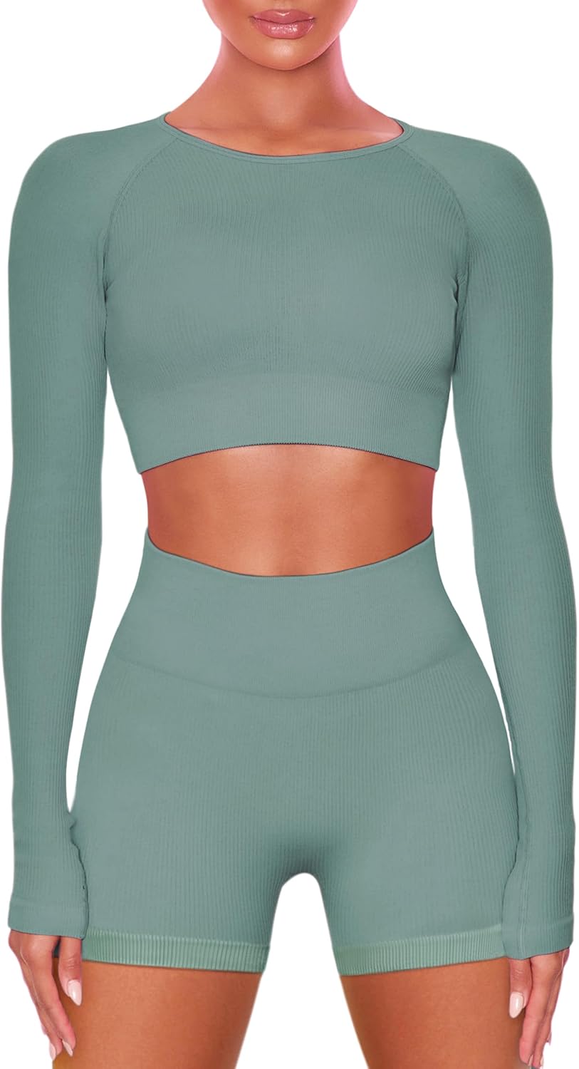 Buttergene Women Workout Sets 2 Pieces Long Sleeve Yoga Outfits Gym Clothes Seamless Ribbed Crop Top High Waist Leggings