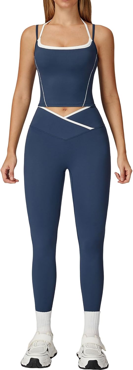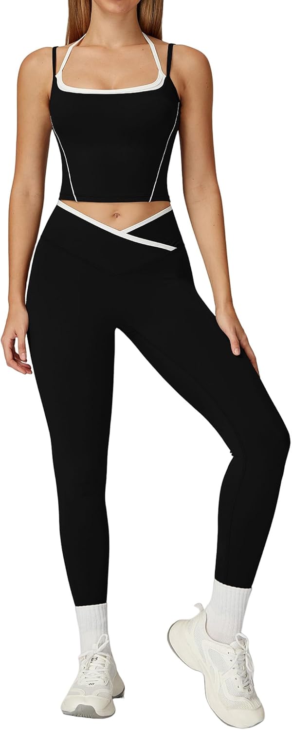 QBGJTD Womens Workout Sets Two Piece Spaghetti Straps Tank Top Matching High Waist Leggings Gym Work Out Outfits with Pockets